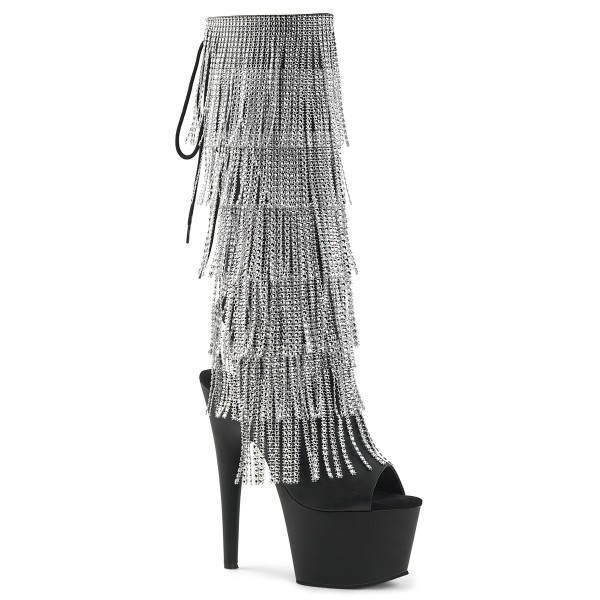 Die Fransen Kniestiefel haben ein 7cm Plateau. Die Fersen- und Zehenpartie sind offen. Der Absatz ist 17,8cm hoch und wird durch den Fransenlook zusätzlich betont. Die Beine wirken länger und werden von den Fransen umspielt. Auf der Rückseite ist eine kleine Schnürung oberhalb angebracht und…