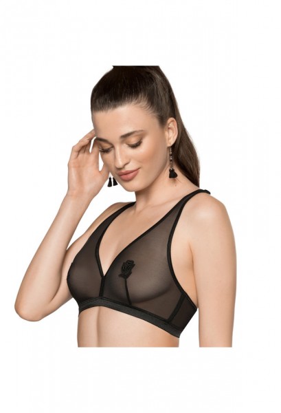 Eleganter Soft-BH gefertigt aus zartem Tüll. Die sich kreuzenden Träger sind verstellbar. Auf der Rückseite mit einem mehrfachverstellbaren Hakenverschluss versehen. Das weiche Material liegt angenehm auf der Haut. Größe: S, M, L, XL Farbe: schwarz Material: 75% Polyamid, 20% Elasthan, 5% Baumwolle Maßtabelle: